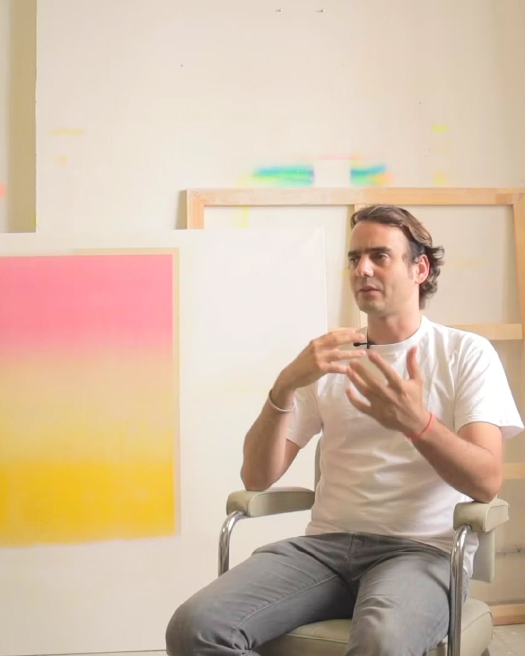 Aujourd'hui, Terencio González travaille directement sur la toile, qu'il prépare et tend lui-même sur châssis. La couleur est projetée, superposée, jusqu'à l'effacement partiel. La lumière surgit de la matière. Le blanc du fond intervient comme une interférence entre sens et perception. L'erreur, le grain, la texture ne sont pas des accidents : ils sont constitutifs de la composition.
